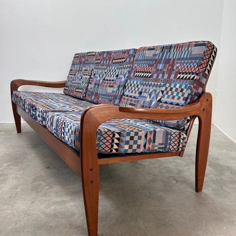 Grete jalk 4 personers sofa med stel i teak og med armlæn og hynder i grøn uld