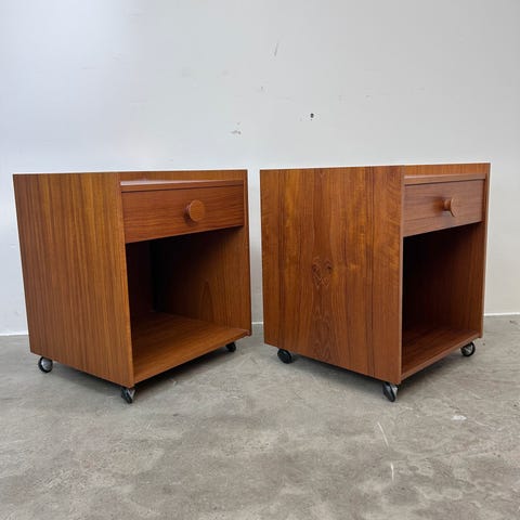 Et sæt sengeborde i fineret teak med massive halv måne greb opsat på stel af eg
