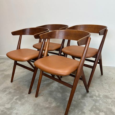 H. W. Klein 4 Stole af massiv eg med kopstykke samlet med synlige sinker af palisander, sæder med senere grå polstring .