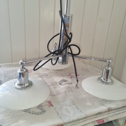 Materialer: Skærme af hvidt opalglas samt stel og fatningshus i højglansforkromet messing og aluminium.