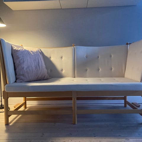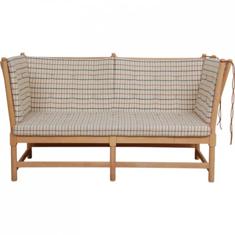 Børge Mogensens tremmesofa fra 1980'erne med stel af lakeret bøg og hynder betrukket med grønt stof. Sofaen fremstår i god stand dog med enkelte mærker og ridser i stellet.