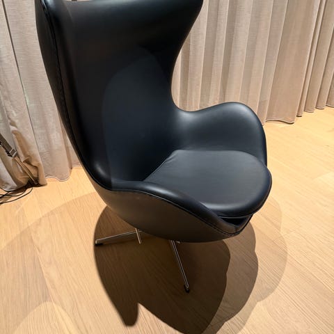 Arne Jacobsen Oksen lænestol med skammel, betrukket i originalt pure aniline læder fra Fritz Hansen. Stolen er fra 2014 og fremstår i flot stand med patineret læder. Stolen har drejefod.