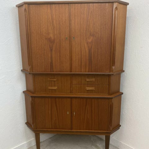 Hjørneskab i palisander med 4 låger og 4 skuffer , indvendig med hylde indretning .