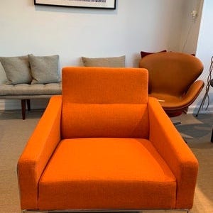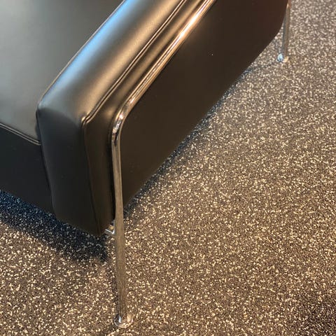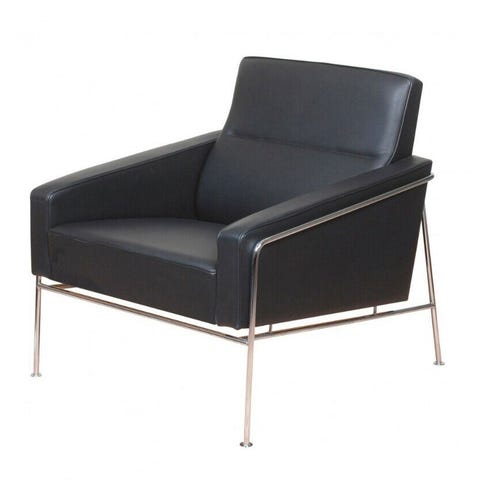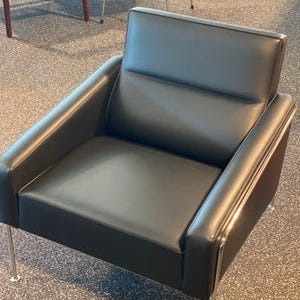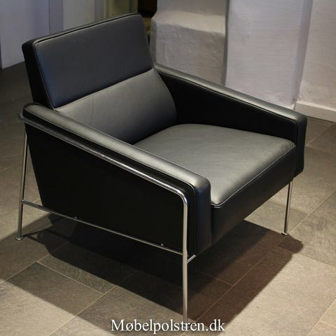 Arne Jacobsen Lufthavnsstol model 3301, betrukket med patineret sort læder. Stolen er fra 1982, men er dog blevet ombetrukket senere hen formodentligt omkring år 2000. Læderet fremstår med flot patina.