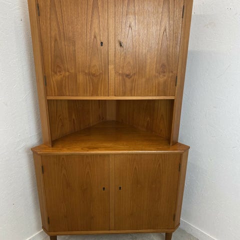 Hjørneskab i fineret og massiv teak ,med små skuffer i bunden og låger i top med barsektion .