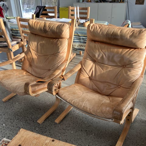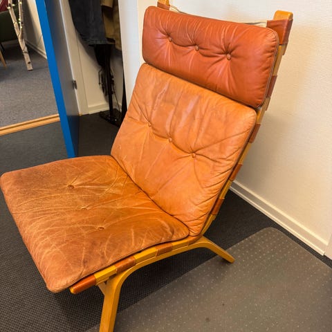 Dansk møbel arkitekt et sæt siesta lænestole i formspændt bøg med patinerede læder hynder . Mål : 68 b - 99 h - 43 Sh . Vare nr 4476