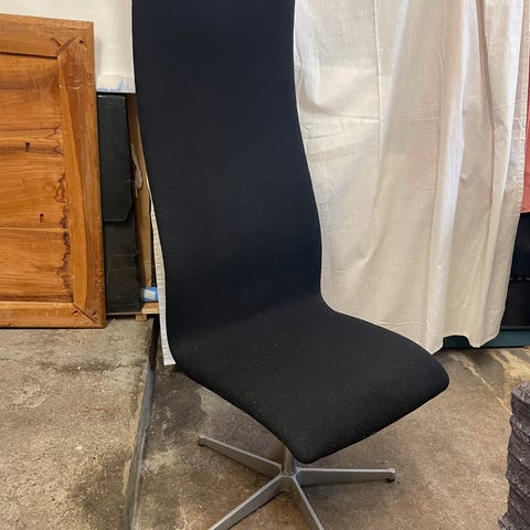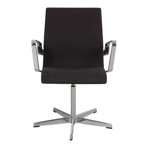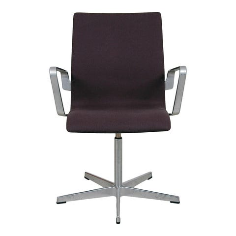 Arne Jacobsen lavrygget Oxford stol af den gamle version med polstret armlæn. Stolene er fra 1987, men er blevet ombetrukket i den nuværende stof for ca 10 år siden. Stolene fremstår i pæn stand med let patineret stof, især på armlænene.