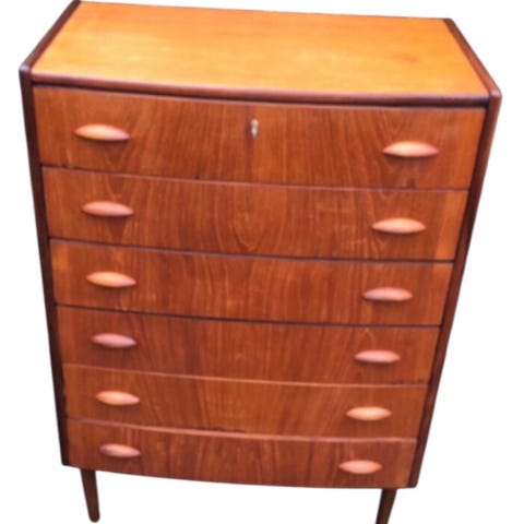 Dansk møbelarkitekt stor kommode I fineret teak . Mål : 99 b - 45 d - 114 h . Fremstår med enkle små brugsspor . Vare nr 4470