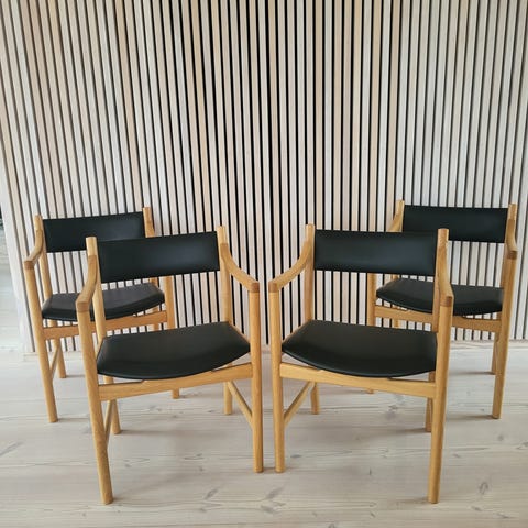 Sæt af 4 Hans Wegner CH-20 stole fra omkring 2015 med stel af sæbebehandlet bøg og sæde betrukket med rødt læder. Stolene fremstår i rigtig flot stand med få små mærker og ridser i stellet.