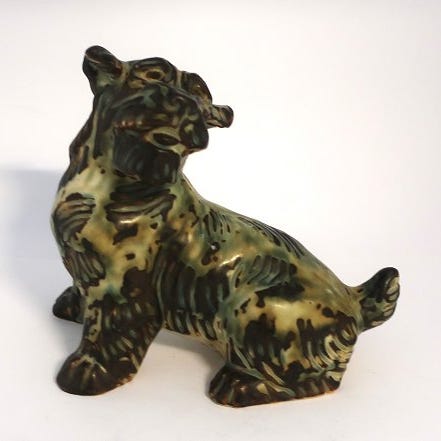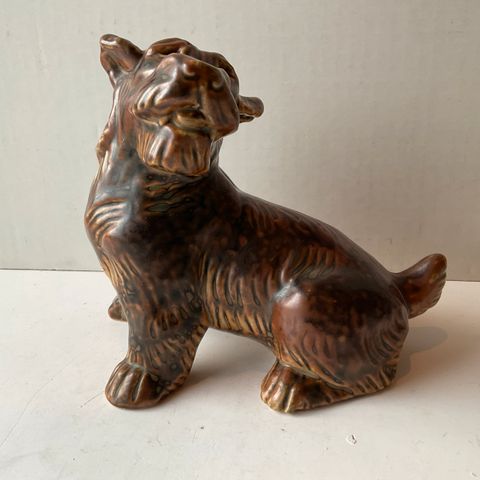 Terrier model 20129 designet af Knud Kyhn for Royal Copenhagen. Udført i stentøj med sungglasur. Et flot eksemplar i 1. sortering uden fejl eller mangler. Længde: 16.00 cm / Højde: 14.00 cm / Bredde: 8.00 cm. Fragt til tilkøbes på hjemmesiden for 89,- Kr.