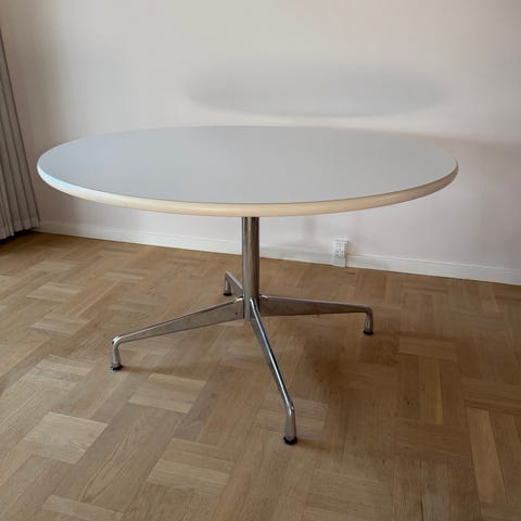 Originalt amerikansk Herman Miller / Eames Segmented Table med bordplade i hvid laminat og 5-pass fod med forkromning. Bordet er stabilt og i pæn vintage stand. Bemærk venligst bordhøjden. Højde: 65,00 cm Diameter: 76,00 cm.