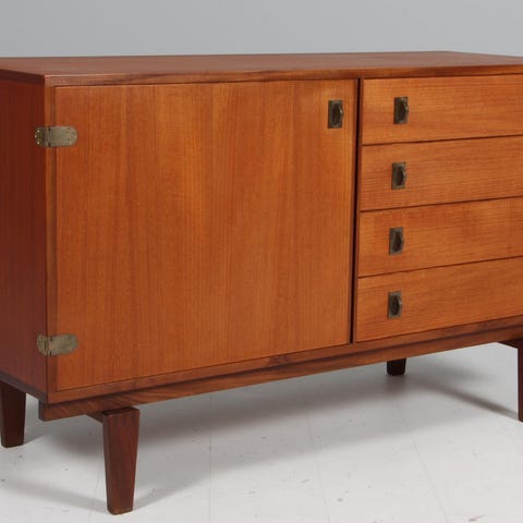 Skab i massiv teaktræ med tilsvarende overskab. Fingertappede samlinger, og selv hylderne er i massiv teak. Designet af Søren Nissen & Ebbe Gehl for den danske producent: Mikael Laursen. Produceret i 1980erne. Fremstår flot med normale lette brugsspor. Dybde overskabe: 32 cm.