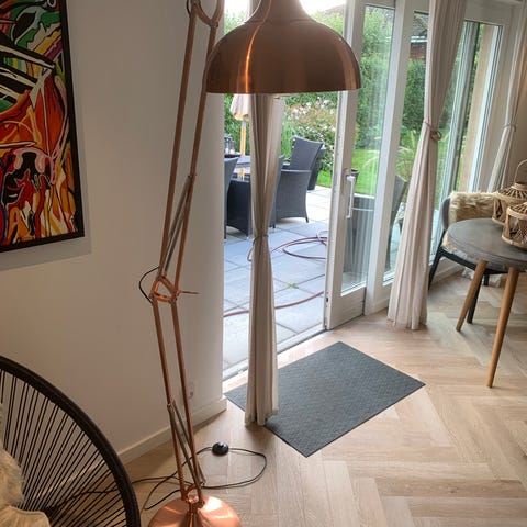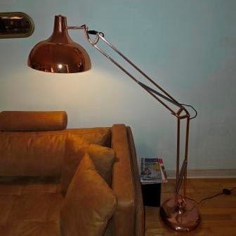 Skærmen er drejelig og kan bruges som uplight. Cannes gulvlampen fås i flere farver – denne er i kobber.