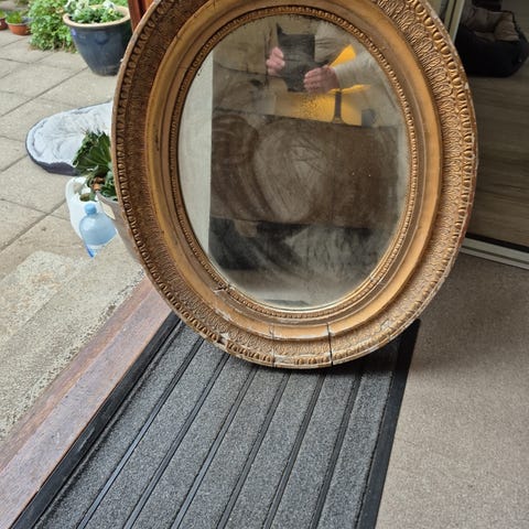 Gammelt ovalt soldaterspejl/bordspejl i støbejern.