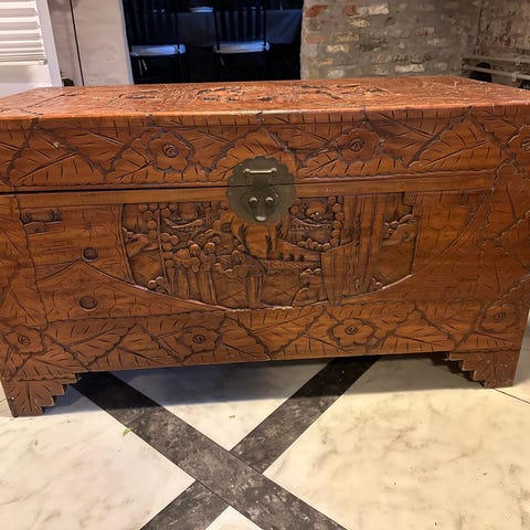 Kinesisk kiste med smukke udskæringer og lås af messing