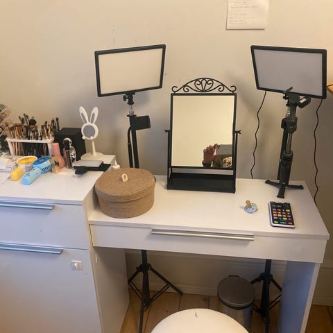 Sminkebord med 3-delt spejl og skammel 90 cm hvid. Flot sminkebord med en skammel og 3 delt spejl. Nu kan du kan starte hver morgen i ro og mag. Cremer, foundations, øjenskygger, børster og andre skønhedsprodukter er lige ved hånden i de 3 store skuffer, 4 åbne rum, på den hævede hylde og på den store bordplade. Spejlet kan åbnes og lukkes og du kan have genstande hængende på det, når det er lukket.