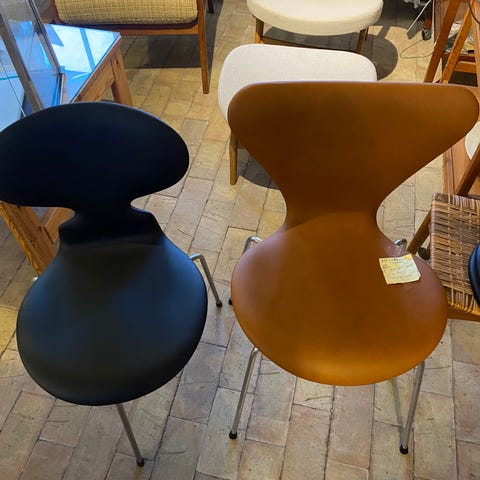 Designet af Arne Jacobsen i 1952. Den ikoniske Myren-stol er her vist i en nyfortolket udgave – ombetrukket med en eksklusiv semianilin-læder i farven Calvados, som har en smuk to-tonet effekt.