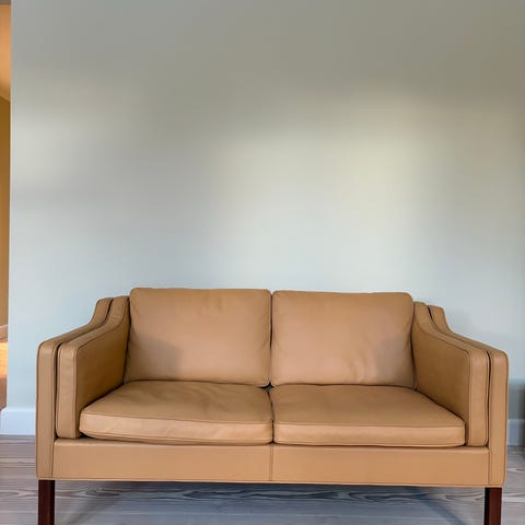 Den tidløse model 2432 – en elegant to-personers sofa designet af den legendariske Børge Mogensen – nu nænsomt istandsat og nypolstret i det luksuriøse “Dunes” anilinlæder fra Arne Sørensen.