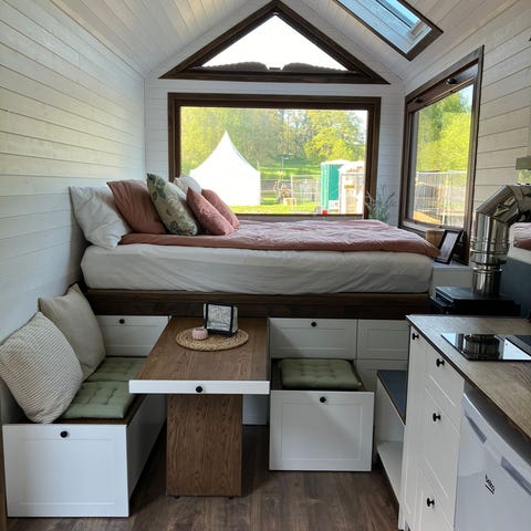 The house comes on a trailer and therefore only needs to be hooked onto the car to be pulled to the next destination!