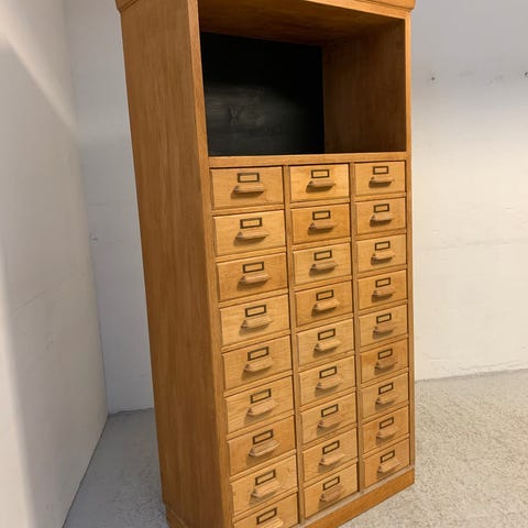 Skabet har 8 udtræksskuffer, med messinghåndtag.