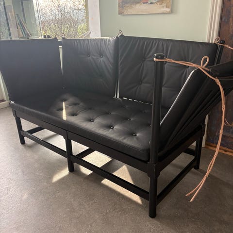 Opdatering af din Børge Mogensen tremmesofa. Afslibning og ny sæbebehandling. Den gamle lak slibes af og sofaen sæbebehandles. Afhentning og levering i hele landet. Sofaen er kun vist som model. Her køber du afslibning og sæbebehandling af din egen sofa. Eventuel limning eller anden form for restaurering af sofaen, beregnes ekstra efter regning.