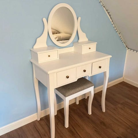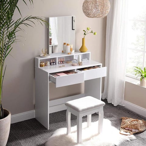 Sort seller hvidt minkebord med spejl og skammel. Elegant sort eller hvidt sminkebord hvor du kan starte hver morgen i ro og mag. Medfølgende skammel der passer flot til sminkebordet. Bordbene er lavet af fyrretræ. Den aftagelige holder har 6 rum til neglelak, øjenskygge, pudder mv. 5 skuffer giver ekstra opbevaringsplads til makeup og smykker