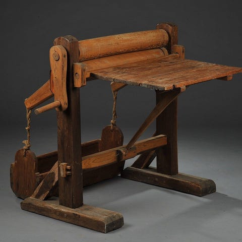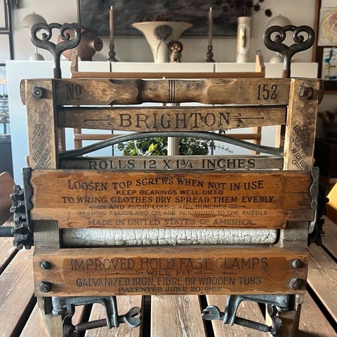 Rulle, Træ, Vaskeskinds rulle som de brugte i gamle dage på tank stadions når man fik vasket forruden kørte han lige vaske skindet igennem og fik ruden fikset vil pynte i et hvert værksted og ved udstilling sammen med Amarikaner bilers værksted eller klub lokale H 43 L 68 B 16
