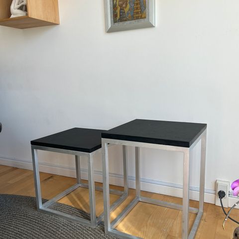 Smukke sideborde. Dado borde har et delikat, men alligevel solidt metalstativ og en aluminiums sandblæst topplade. Bemærk hvordan det lille sidebord nemt kan glide helt ind under det store sidebord og skjule sig helt eller trækkes ud til den position som der ønskes. Bordet kan stå som et sidebord, men kan også bruges som et lille sofabord i rum, hvor der ikke er meget plads.