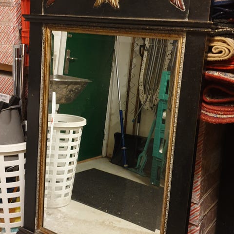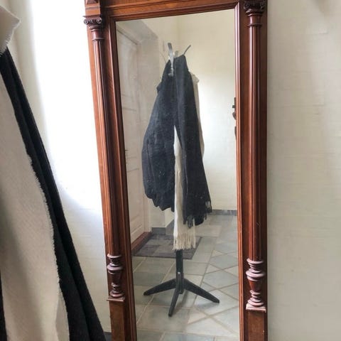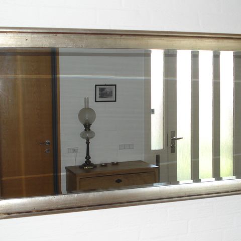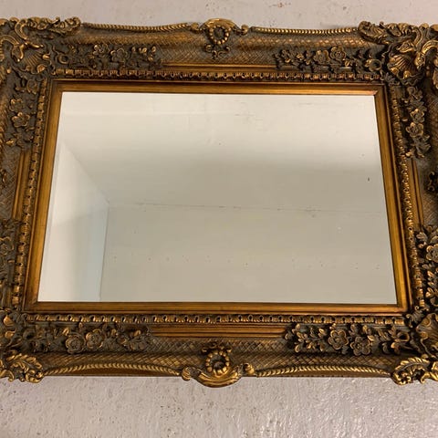 Flot spejl med facetslebet glas og råhvid ramme med ornamenteringer.
