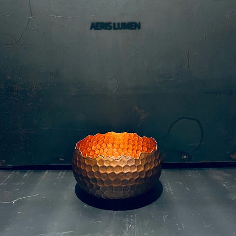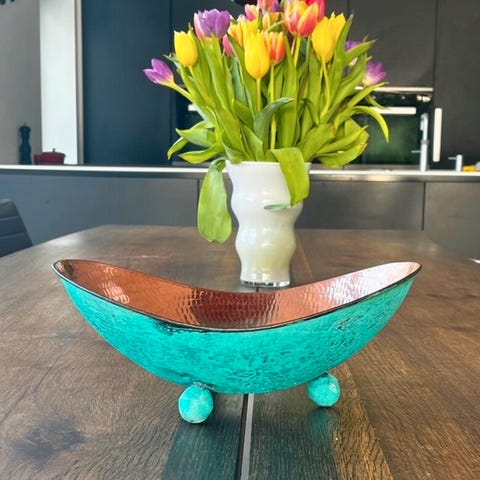Oxideret kobberskål på 28 cm. Smuk og unik kobberskål. Du kan se det håndbanket kobber indvendigt og udvendigt kan du se selve oxideringen af kobberet i den smukkeste grønne farve.