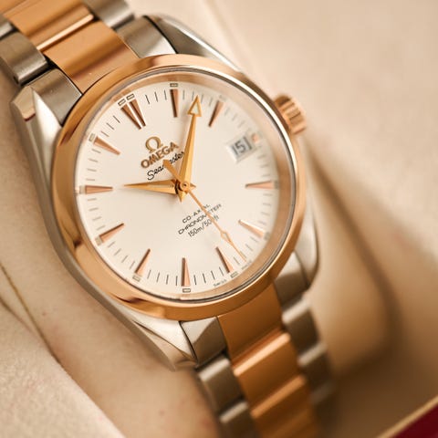 Omega Seamaster Aqua terra. En rigtig flot model i rosa guld og stål. Uret er født med læderrem og foldespænde, som også følger med. Lænken er tilkøbt senere hen og giver uret et helt andet look. Uret måler 41,5 mm og kommer med boks og papirer fra 2014.