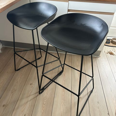 2 barstole i træ med sort stel. Meget billige barstole. Bemærk, at prisen er for begge barstole og kan kun købes som et sæt. Maks belastning pr. stol er på 120 kg.