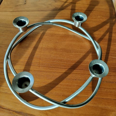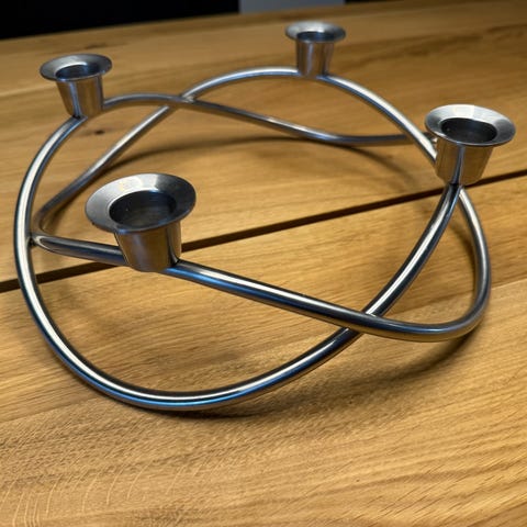 Smuk adventsstage eller lyseholder, til 4 lys. Design af Maria Bentzen i 2006 for Georg Jensen. Her i materet stål. Brugt med ingen eller helt let patina. Lys medfølger ikke men vises for at illustrere designet. Ø 26 cm. H: 9 cm. Når du køber brugte gaver, bidrager du til den cirkulære økonomi som en del af en grønnere livsstil.