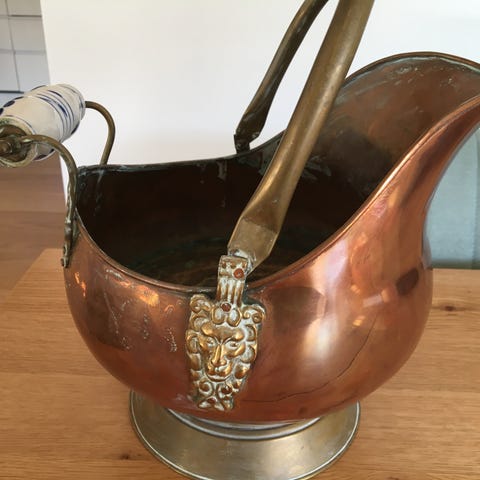 Flot, poleret spand, udført i kobber, med håndtag og knop i messing.