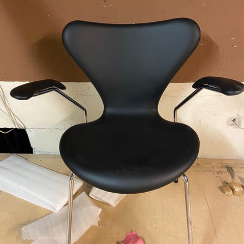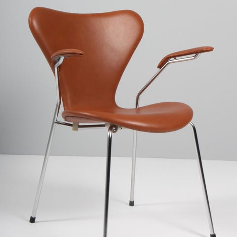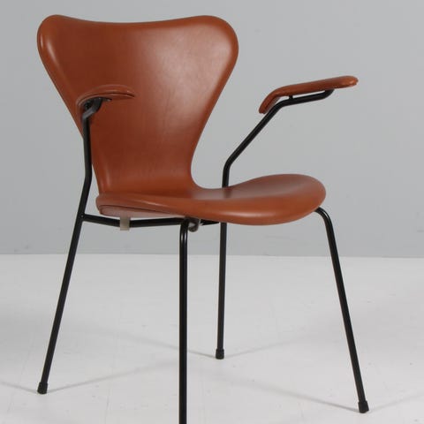 Nypolstret Arne Jacobsen stol model 3207 med armlæn Nypolstret med Brandyfarvet anilinlæder. Sædehøjde 44 cm. Anilinlæder med naturlig og åndbart narv, som giver den optimale siddekomfort. Se mere i forretningen og på hjemmesiden. Pris for 1 stol.
