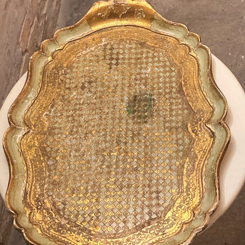 SOLGT. Gylden med rød ornamentik: i fornuftig stand med slitage. Ø 43cm.