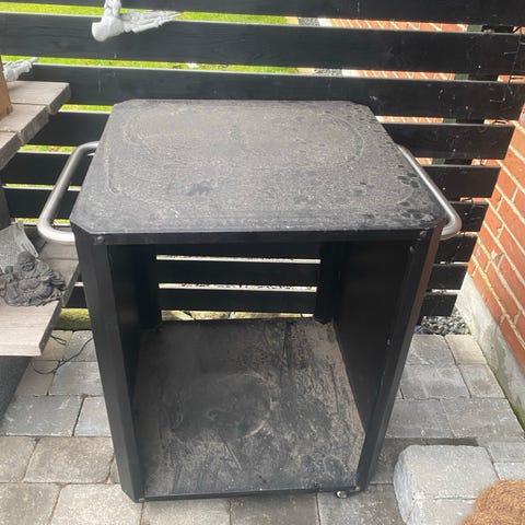 Gasbord med lyse fliser kakler, fremstår med charmende patina på jernstel. Perfekt til udekøkken eller landkøkken.