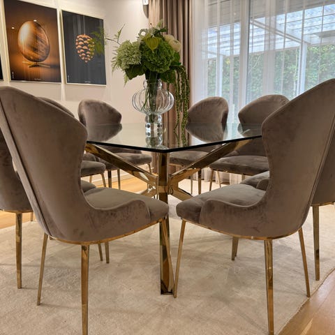 Flot spisebord og 4 stole. Metalstel, flettet med peddigrør. Bordplade i facetslebet glas. Alt i eksklusiv udførelse, oprindeligt købt hos Kollund Møbler. Glaspladen med almindelige lette overfladeridser. Sælges samlet som sæt. Uden lammeskind. Se venligst flere fotos på hjemmesiden og i forretningen. Samlet pris.