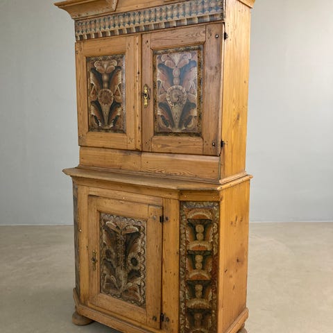Flot antikt skab i dyb mørk grøn, placeret på træsokkel, malet i grøn.