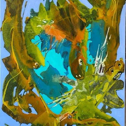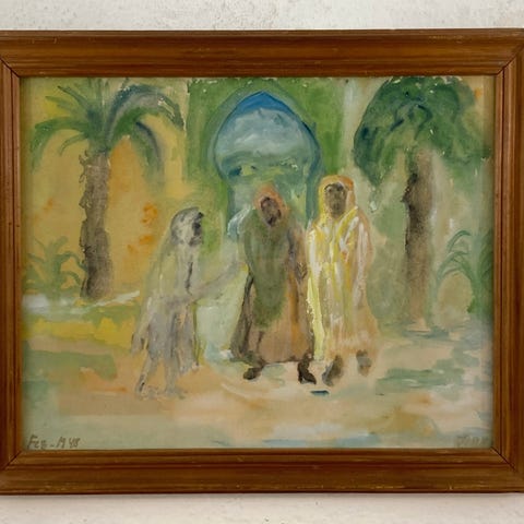 Nr. 219-2 Ejvind Schaldemose f. 1926. Akryl på lærred "På ferie". Uddannet på Kunstakademiet i KBH (S. Hjort Nielsen og Palle Nielsen), arbejder i et ekspressivt og farverigt formsprog.