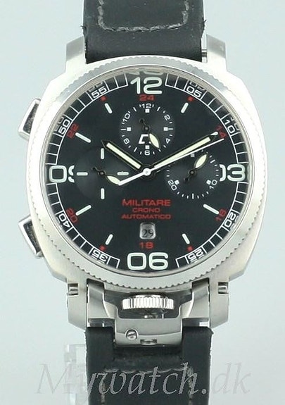 Kassen i mat sort stål, sort drejekrans, skruekrone, fast bagkasse, safirglas, 3D sort / grå mønstret skive, hvide / luminor visere, luminor timemarkeringer, samt datovisning. Monteret med original håndlavet læderrem, afsluttet med mat sort stålspænde.
