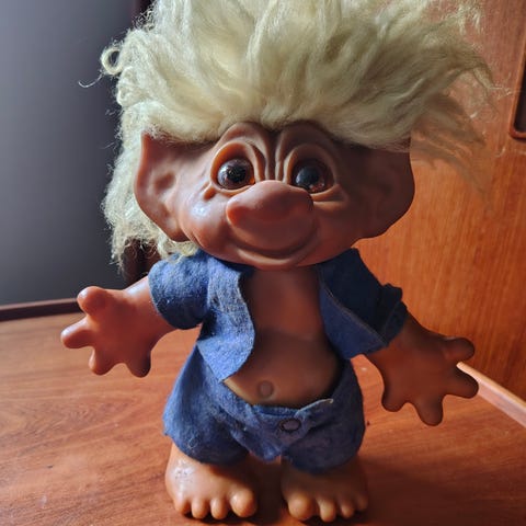 NY PRIS - Fin og velholdt trold fra Gjøl / Thomas Dam. 1984 , højde 16 cm. Røde bukser og bluse fra Bornholm :)