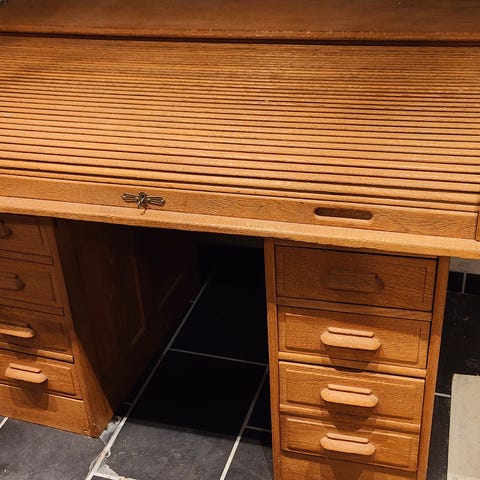 Robust og gedigent, i massiv lys egetræ, med jalousilåge til nedlukning.