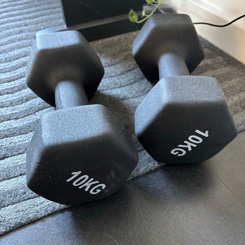 Dette sæt af håndvægte egner sig perfekt til hjemmetræning i et materiale af hårdt sammenpresset gummi med et håndtag af metal. Disse vejer 7,5kg stykket og er lavet i en sekskantet form med flad bund så man også har et solidt fundament hvis man lægger vægt på dem.