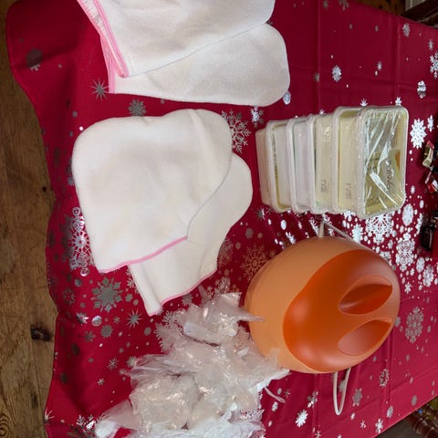 Flot praktisk parafin fodbad med komplet tilbehør. Sokker, luffer og handsker, parafin og pensel medfølger.