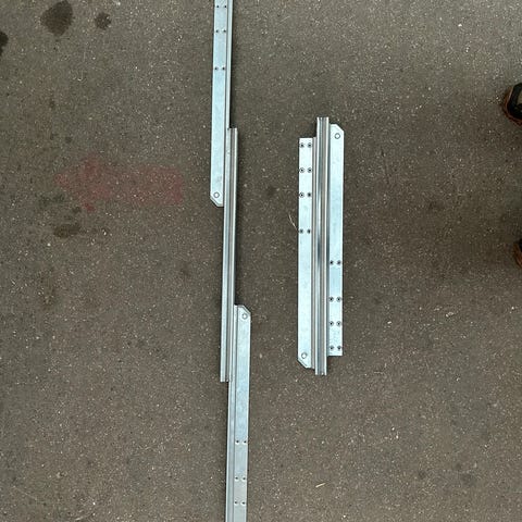 Udtræk til spisebord Universalt udtræk / skinnesystem til spisebord. Dette skinnesystem passer til et bord med udtræk til f.eks. 3 plader á 50 cm, eller tilsvarende. Udtræk total 150 cm. Bruges f.eks. til Piet Hein og andre spiseborde. Der er ikke magasin i udtrækket, så pladerne skal opbevares et andet sted når de ikke er i brug. Skinnesystemet kører i kuglelejer og en god erstatning for et gammelt slidt udtræk. Med støtteben. Skinnesystemet måler sammenklappet 74 cm. Sætpris. Se også andre størrelser på hjemmesiden.