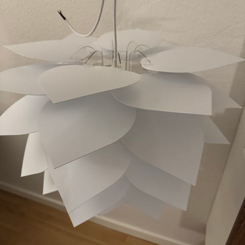 Farven er printet på de hvide blade, og giver et flot lys skær. Lampen er klassisk, elegant og kan passe ind i alle miljøer.