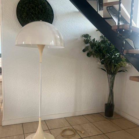 Panthella gulvlampe, brugt i god stand med den normale patina og gulnede farve. Designet i 1971 og produceret hos Louis Poulsen. God brugt stand med normale lette brugsspor. Plast og akryl. Se. evt. mere på hjemmesiden.