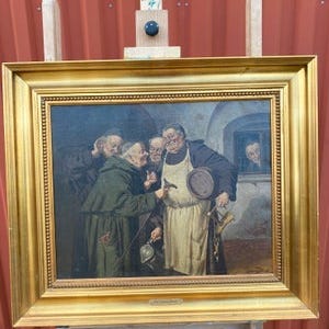 Motiv af øldrikkende munke. Et typisk humoristisk motiv af kunstneren. Signatur af Simony Jensen.