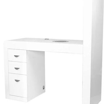 Flot neglebord i hvid højglans for nem rengøring, der er 3 skuffer i venstre side, samt højre side går over bordet hvor der er monteret små glashylder med lys for display.